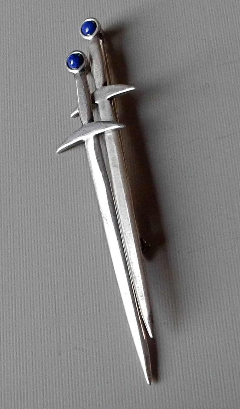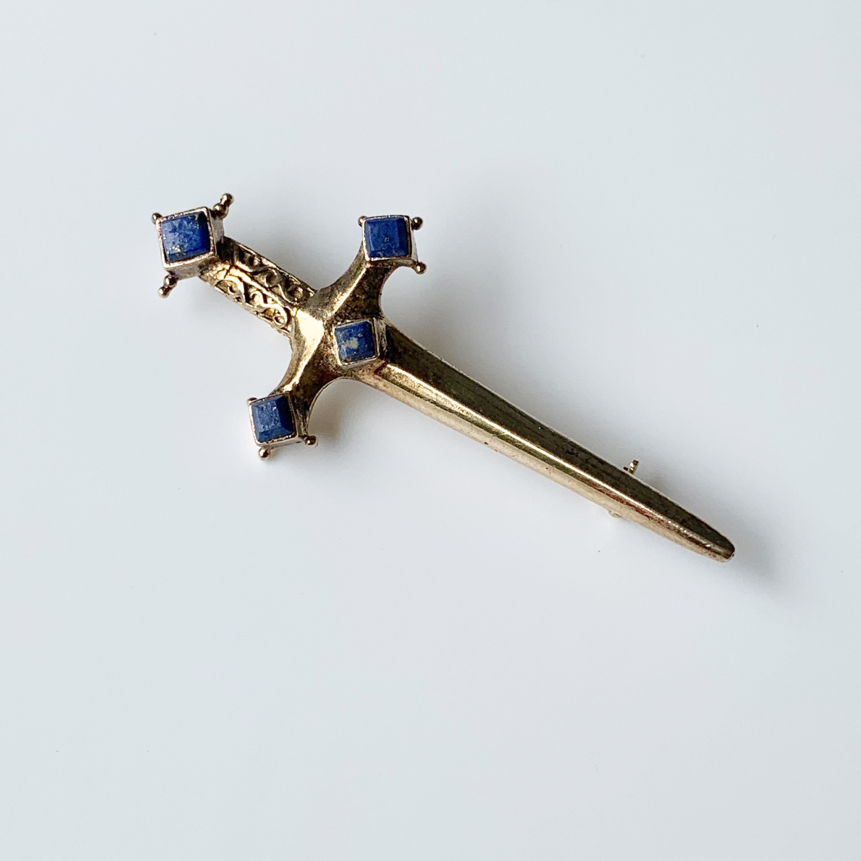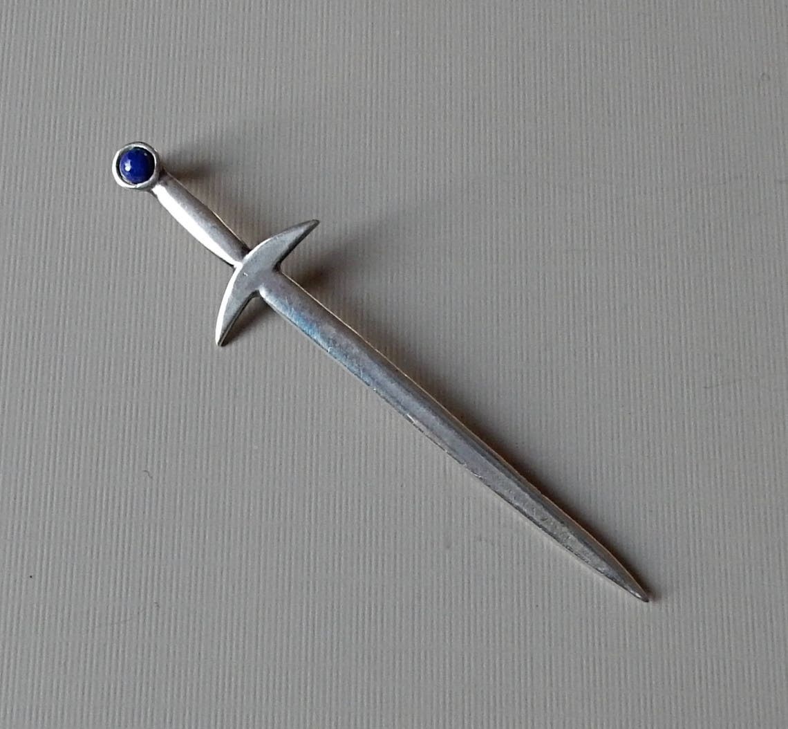 An intriguing accessory to adorn your wardrobe. This 22 karat etruscan style sword pin is decorated with a twisted wire motif and three richly toned lapis lazuli beads. Emeraldsword recipe:2 emeralds + 2 emeraldglue + emeraldrod = emeraldsword.