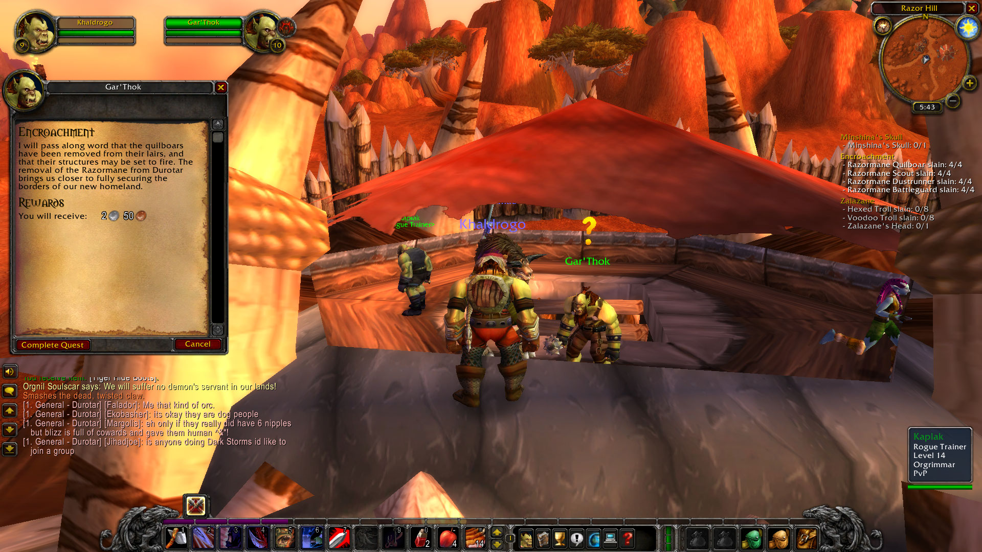 Encroachment Classic Wow. This npc can be found in durotar. If the ango'rosh ogres have their way, this temple will not stand much longer. Kill 4 razormane quilboars, 4 razormane scouts, 4 razormane dustrunners and 4 razormane battleguards for gar'thok at razor hill. • travel southwest to the vicinity of coords 36, 31. Description when we arrived, the razormane quilboars possessed much of the land, and proved a thorn in our sides. A level 12 orgrimmar quest. Added in classic world of warcraft. When we arrived, the razormane quilboars possessed much of the land, and proved a thorn in our sides. Amani berserker slain (5) amani axe thrower slain (5) description ours are not the vast kingdoms of the humans and orcs. Comment by thottbot nice armor, stats and two sockets as well. Kill 10 ango'rosh ogres and 5 ango'rosh shaman and return to ikuti at the orebor harborage. Ango'rosh encroachment • accept the quest, ango'rosh encroachment, from ikuti at coords 41.8, 27.2 (orebor harborage). Encroachment view source the subject of this article was removed in patch 4.0.3a but remains in world of warcraft: The zangar encroachment[1] or zangar fungal encroachment[2] is the name given to the various fungal swamps found across the shores of draenor, caused by the zangar sea seeking to overtake the land by releasing thousands of spores and slowly growing inland over time.[3] the zangar sea, and thus the zangar encroachment, was created from the rotting body of the. It has gone on long enough, however.